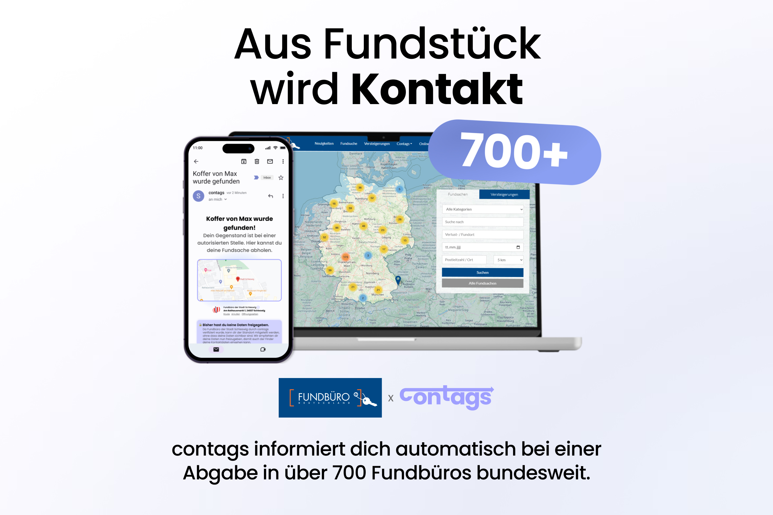 Das Besondere an contags ist die exklusive Kooperation mit Fundbüro Deutschland und bietet damit eine deutschlandweite Infrastruktur für Fundsachen. Das bedeutet: